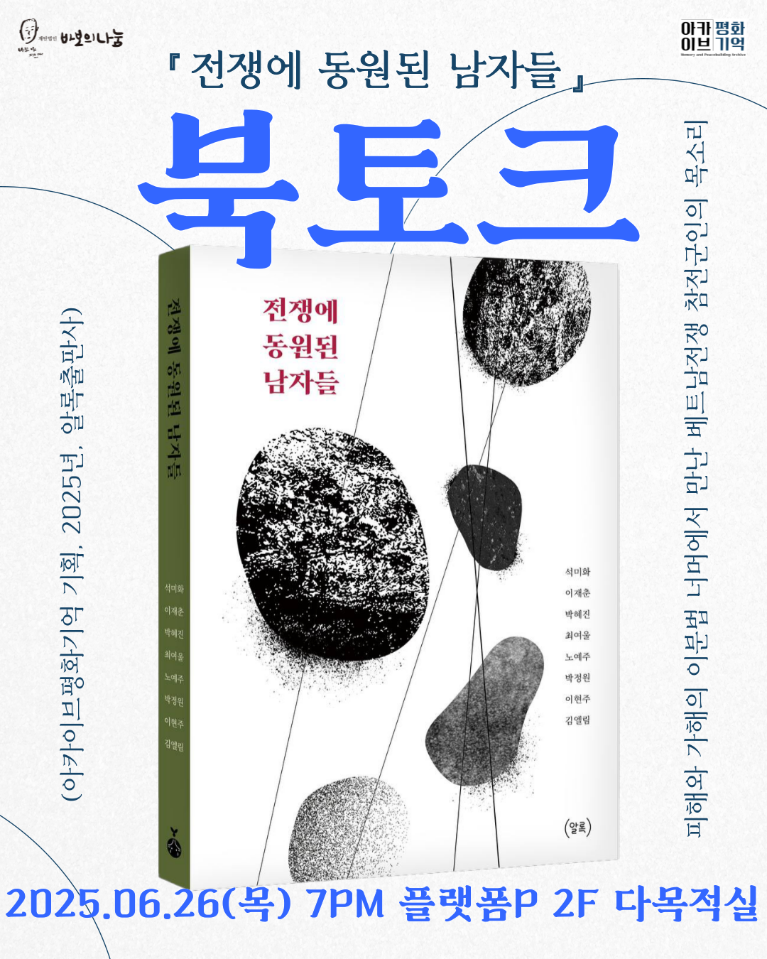 이야기를 들려준 이는 유성원(가명), 안익순, 류진성, 오경열, 송금술, 최홍희입니다. 참전군인과 연루된 가족 이재춘, 강성오의 이야기도 담았습니다. 듣는 자리에서 석미화, 이재춘, 노랭, 이응, 노예주, 박정원, 이현주, 김엘림이 글을 썼습니다. 책 발간 후 처음 갖는 북토크 자리인 만큼 말한 이와 듣고 쓴 이들이 설레는 마음으로 함께할 예정입니다. 관심과 응원으로 함께해 주실 거라 믿어요. 그럼, 북토크에서 풍성한 이야기로 만나요!