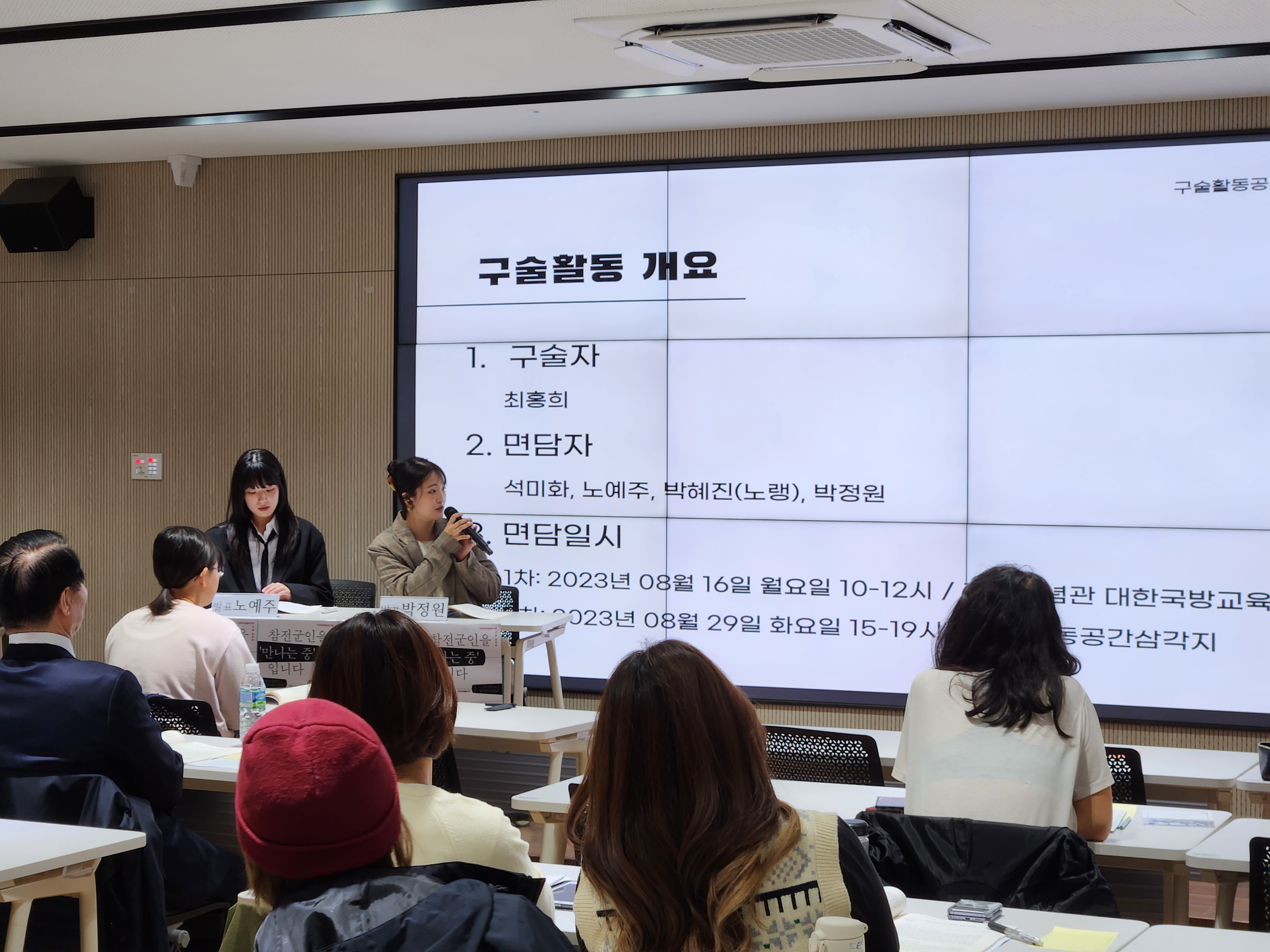 구술자 최홍희와 면담자 석미화, 노예주, 박정원, 노랭은 두차례 만남을 가졌다. 첫 만남은 2023년 8월 16일, 최홍희가 활동하고 있는 전쟁기념관 대한국방교육진흥회의 사무실이었다. 이후 2023년 08월 29일, 삼각지의 한 회의실에서 두 번째 만남을 가졌다. |