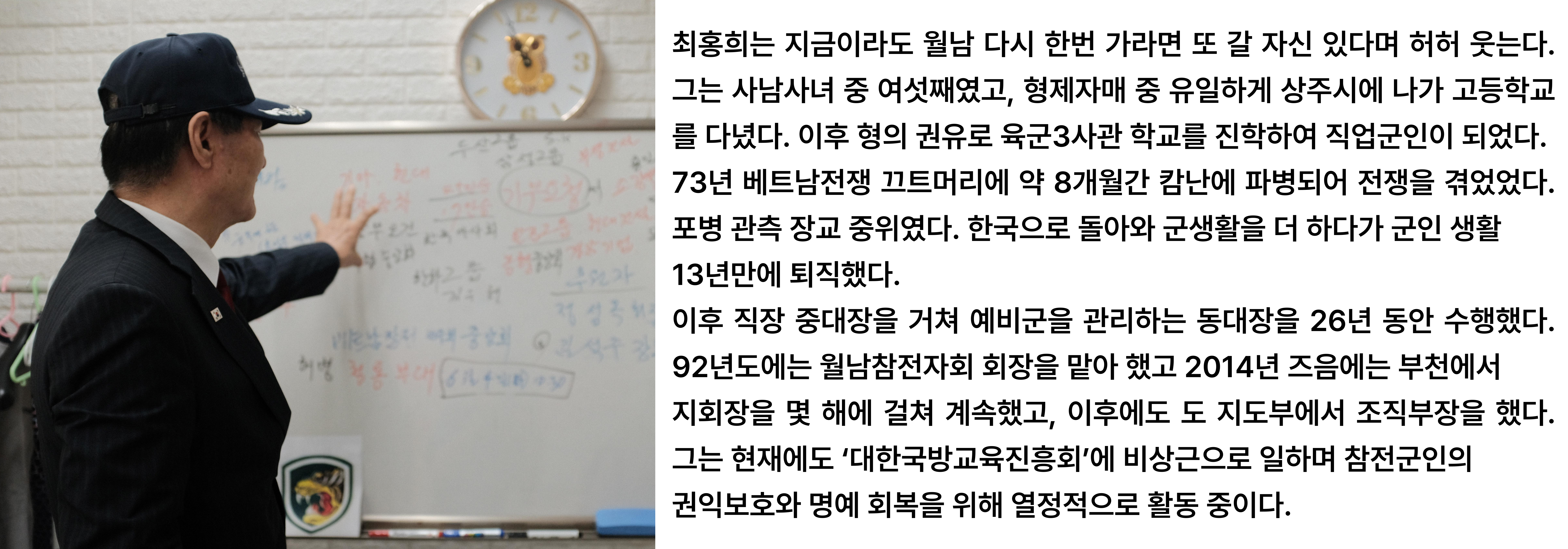 베트남전쟁을 직접 경험하지 않았던 세대로서 내게 최홍희와의 만남은, 당사자의 목소리를 통해 역사적 사건을 비전형적으로 추적하는 작업이었다. 나는 구술자의 기억을 통해 만나는 역사가 국가적, 전형적 역사를 벗어난, 확장된 기록이 되기를 기대한다. 또한 사회적 소통이 이루어지지 않아 더욱 서로 이해할 수 없게된 지점들을 만남을 통해 드러내고, 충돌하면서 서로의 세계에 균열을 내기를 바란다.