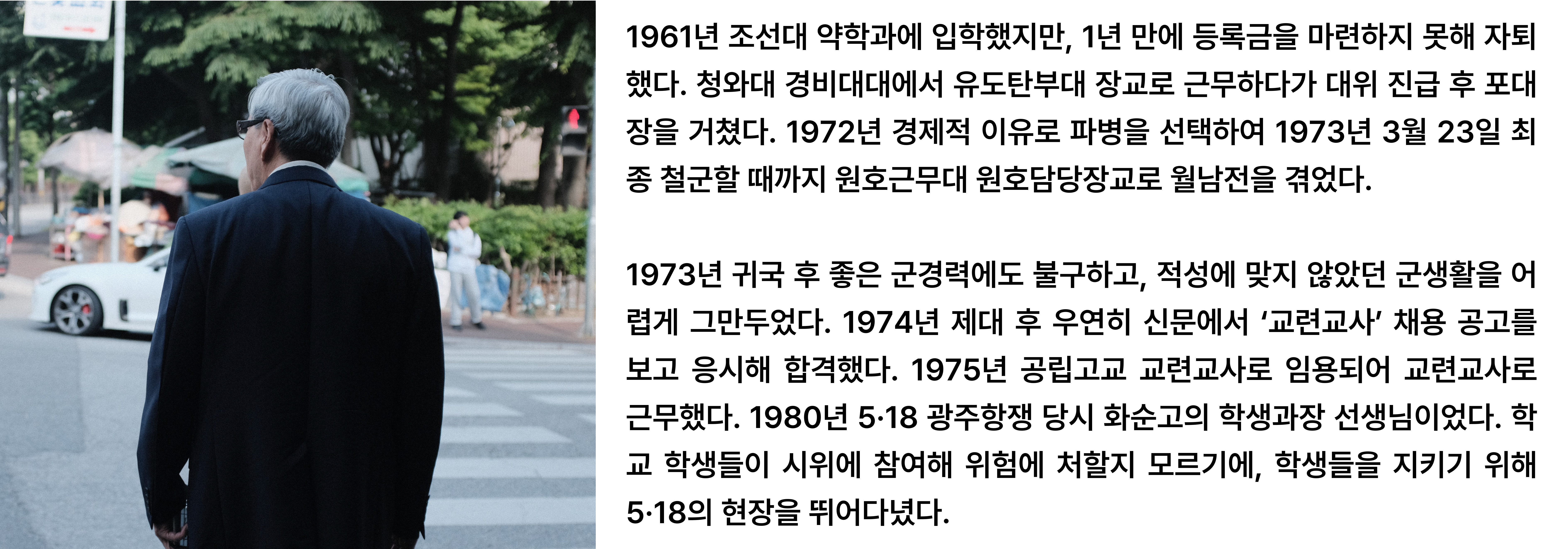 그는 2023년 늦가을 만남에서 “요즘 같은 시대였다면, 직업군인을 안했을 거예요.”라고 말했다. 맞다. 그는 그런 시대가 아니었다면, 직업군인을 선택하지도 월남전 파병을 선택하지도 않았을 것이다. 하지만 원치 않았던 군인으로서도 그렇고 교사로서도 항상 공부하고 연구하는 자세로 삶을 살았다.
